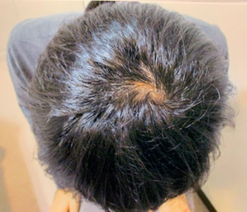 M字、頭頂部の分け目が特に目立っていました。当院の発毛治療でM字は改善され、薄くなっていた箇所はわからなくなるほどに回復しました。